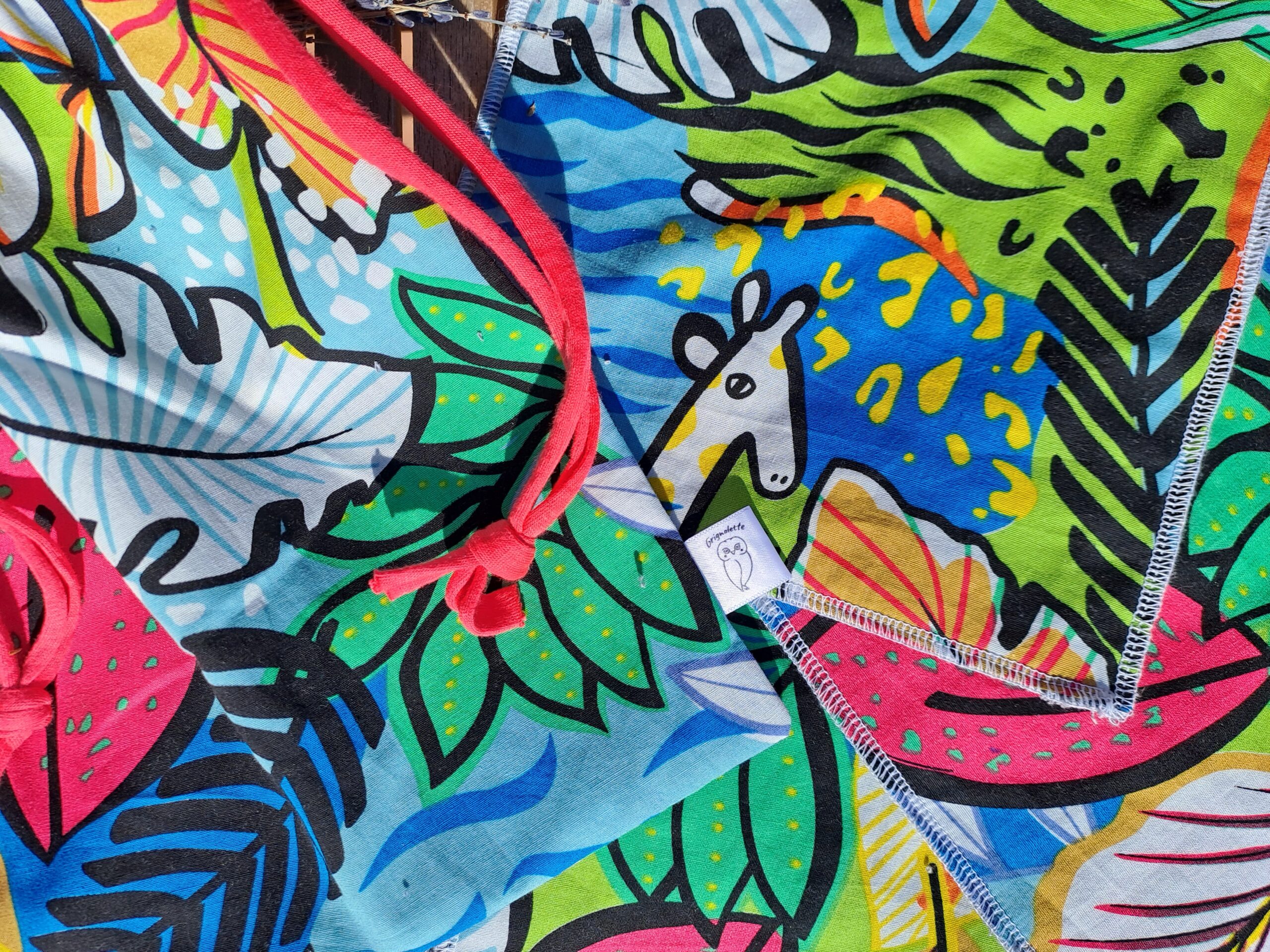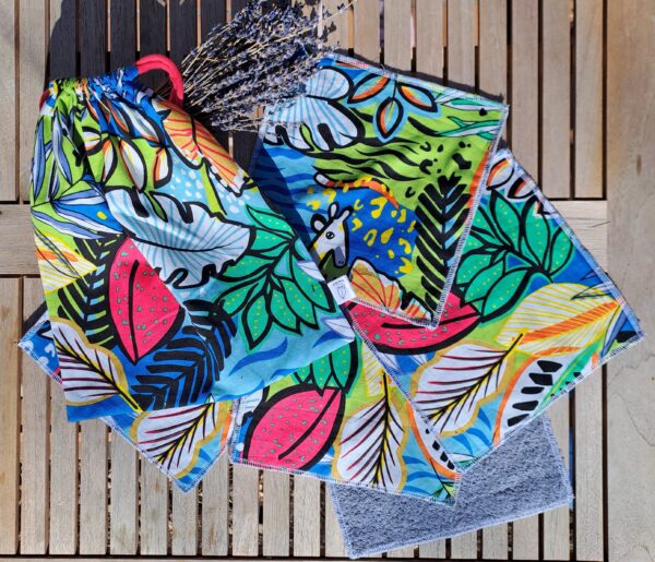 Essuie-tout lavables – Jungle est composé d’un tissu coloré avec des feuilles et des animaux de la jungle.