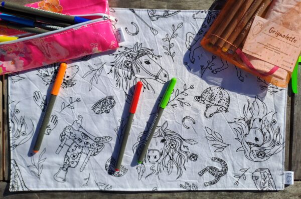 La feuille de coloriage est composé d’un côté blanc pour laisser votre enfant exprimer sa créativité et d’un côté à motif sur le thème de la plage. Il est aussi possible d’utiliser des gommettes sur la feuille de coloriage. Le tissu permet de pouvoir coller, décoller et recoller les gommettes plusieurs fois. La feuille de coloriage est l’alternative zéro déchet aux feuilles de papier.