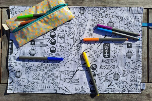 La feuille de coloriage est composé d’un côté blanc pour laisser votre enfant exprimer sa créativité et d’un côté à motif sur le thème de la plage. Il est aussi possible d’utiliser des gommettes sur la feuille de coloriage. Le tissu permet de pouvoir coller, décoller et recoller les gommettes plusieurs fois. La feuille de coloriage est l’alternative zéro déchet aux feuilles de papier.