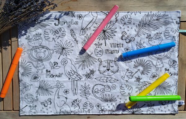 La feuille de coloriage est composé d’un côté blanc pour laisser votre enfant exprimer sa créativité et d’un côté à motif sur le thème de la plage. Il est aussi possible d’utiliser des gommettes sur la feuille de coloriage. Le tissu permet de pouvoir coller, décoller et recoller les gommettes plusieurs fois. La feuille de coloriage est l’alternative zéro déchet aux feuilles de papier.