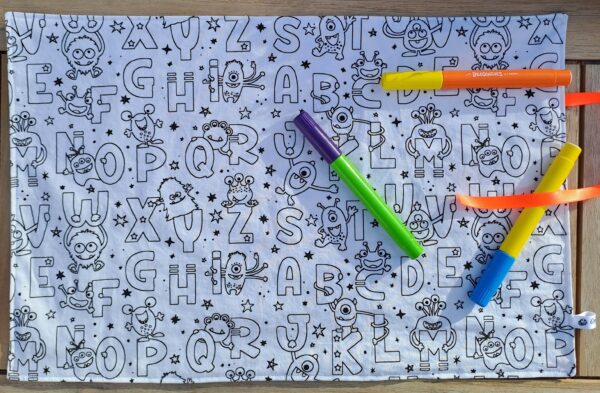 La feuille de coloriage est composé d’un côté blanc pour laisser votre enfant exprimer sa créativité et d’un côté à motif sur le thème de la plage. Il est aussi possible d’utiliser des gommettes sur la feuille de coloriage. Le tissu permet de pouvoir coller, décoller et recoller les gommettes plusieurs fois. La feuille de coloriage est l’alternative zéro déchet aux feuilles de papier.