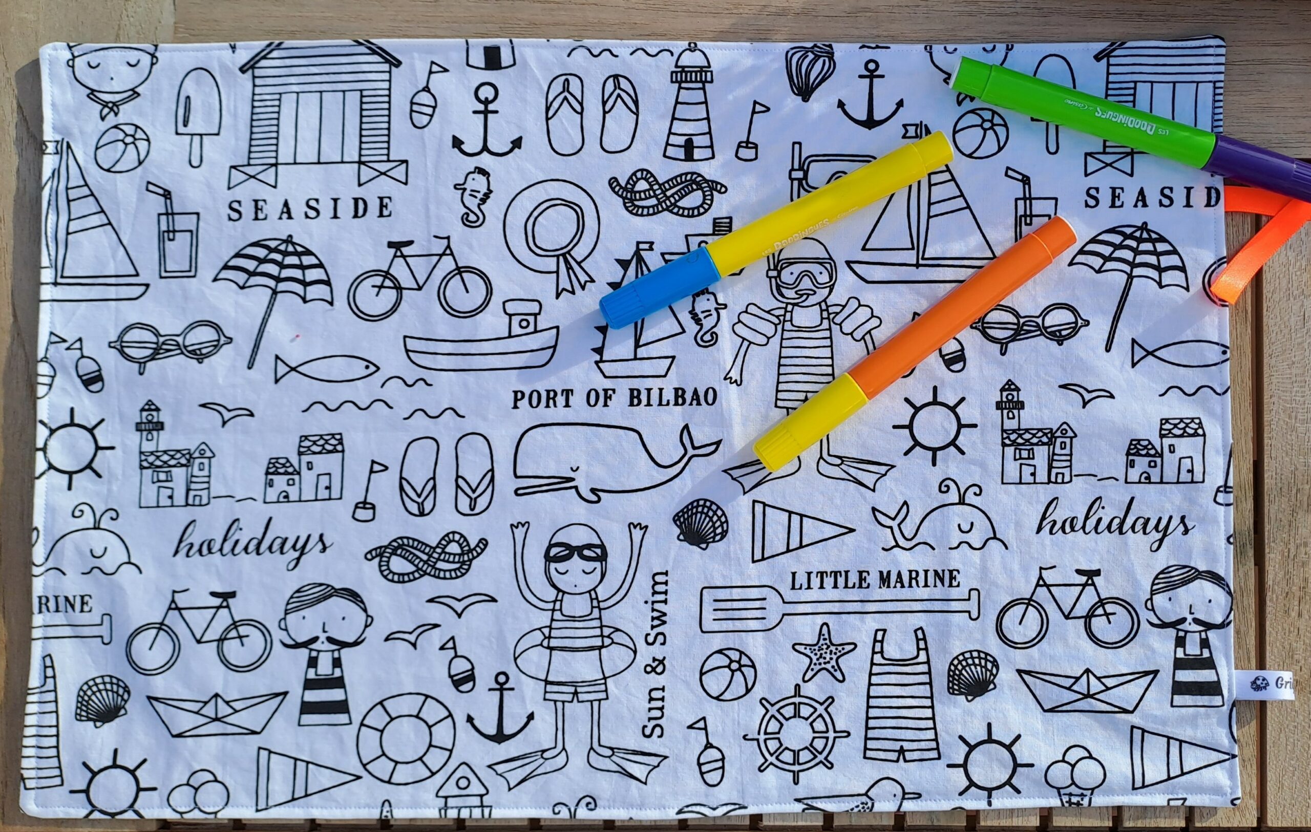 La feuille de coloriage est composé d’un côté blanc pour laisser votre enfant exprimer sa créativité et d’un côté à motif sur le thème de la plage. Il est aussi possible d’utiliser des gommettes sur la feuille de coloriage. Le tissu permet de pouvoir coller, décoller et recoller les gommettes plusieurs fois. La feuille de coloriage est l’alternative zéro déchet aux feuilles de papier.