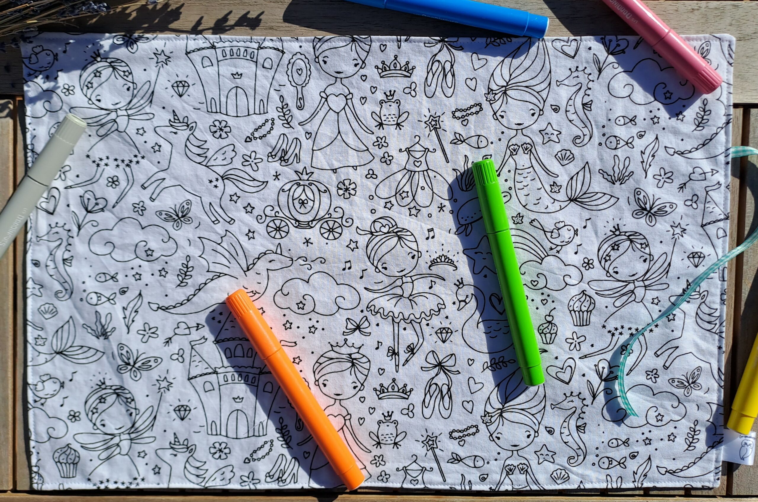 La feuille de coloriage est composé d’un côté blanc pour laisser votre enfant exprimer sa créativité et d’un côté à motif sur le thème de la plage. Il est aussi possible d’utiliser des gommettes sur la feuille de coloriage. Le tissu permet de pouvoir coller, décoller et recoller les gommettes plusieurs fois. La feuille de coloriage est l’alternative zéro déchet aux feuilles de papier.