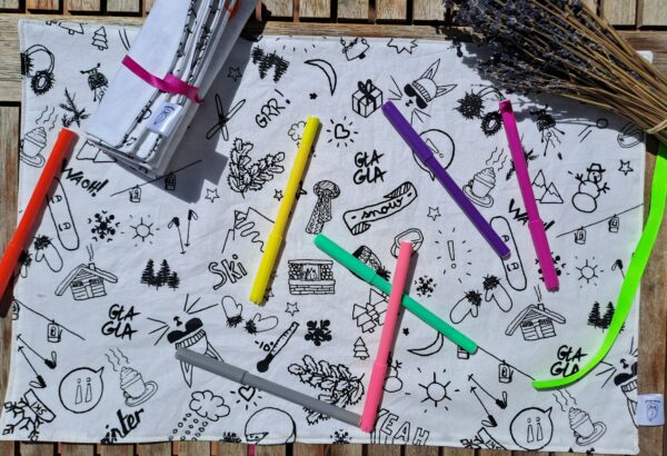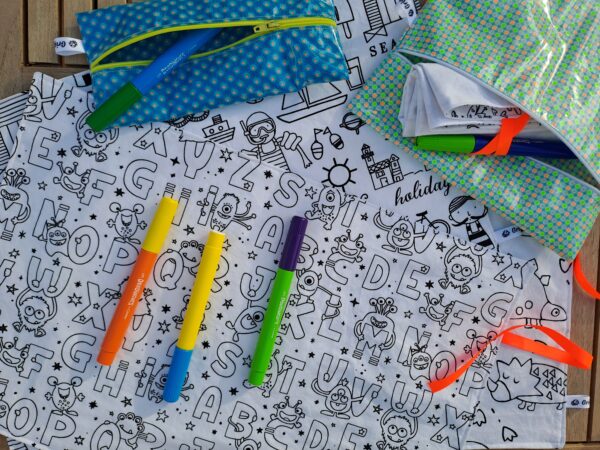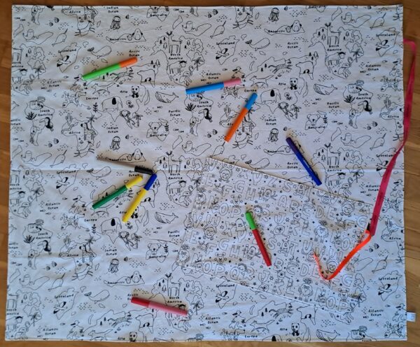 La feuille de coloriage est composé d’un côté blanc pour laisser votre enfant exprimer sa créativité et d’un côté à motif sur le thème de la plage. Il est aussi possible d’utiliser des gommettes sur la feuille de coloriage. Le tissu permet de pouvoir coller, décoller et recoller les gommettes plusieurs fois. La feuille de coloriage est l’alternative zéro déchet aux feuilles de papier.