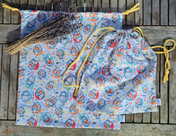 Le pochon paquet cadeau Doraemon. Ce petit chat-robot, Doraemon, fait parti d’une série de mangas japonais. Il est envoyé du futur pour aider un jeune garçon nommé Nobita Nobi.