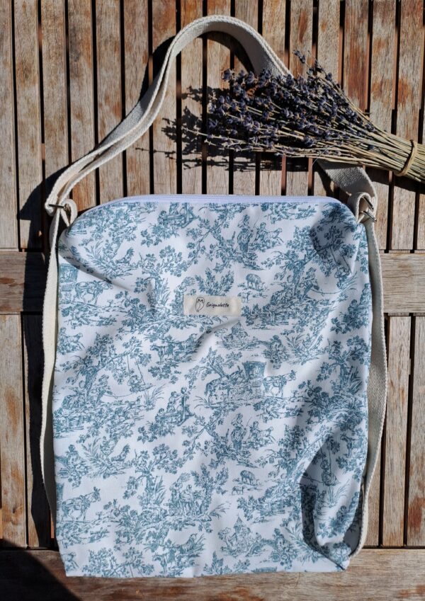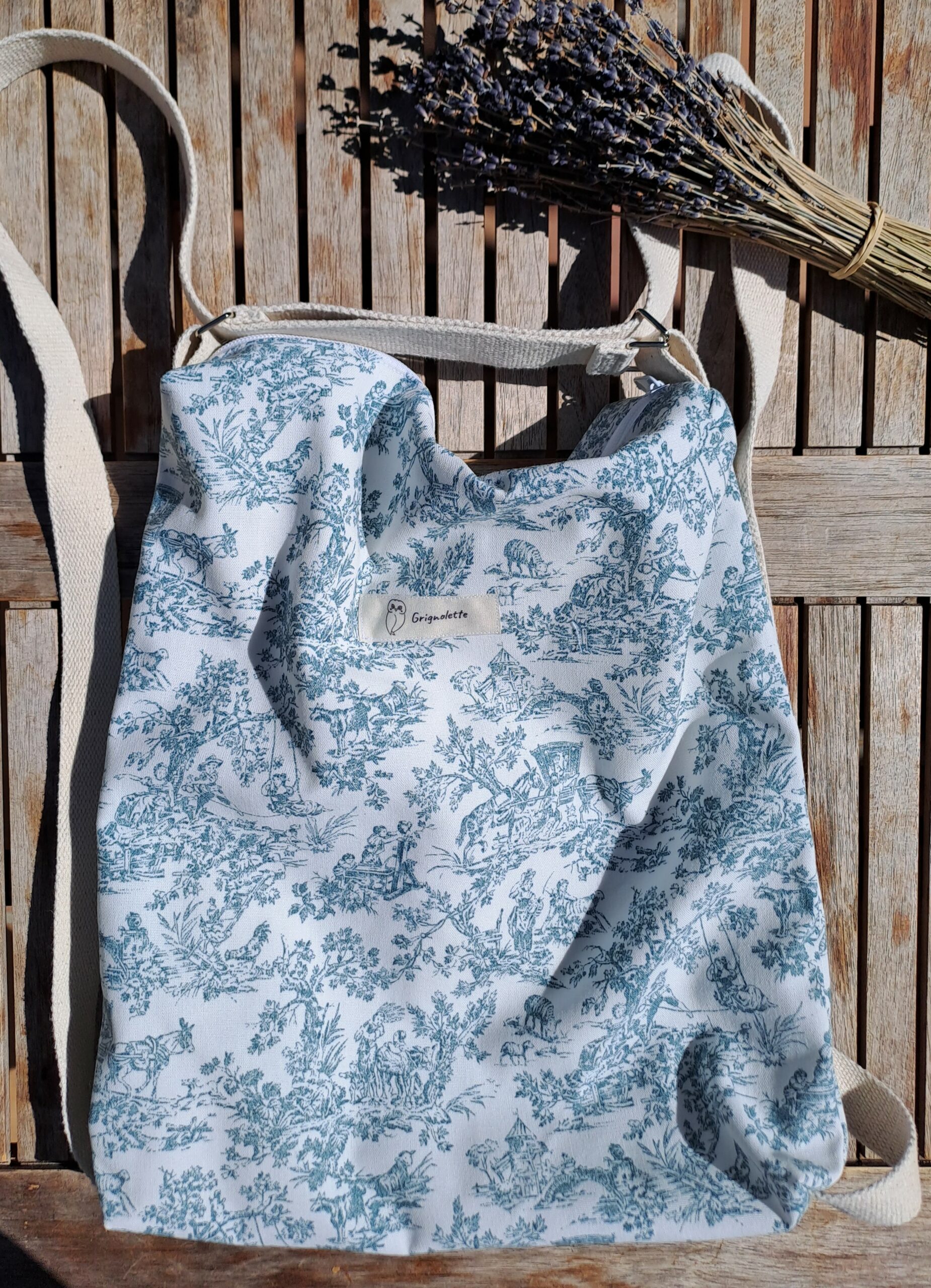 Ce sac est conçu en toile de Jouy. Ce tissu est fabriqué à partir de coton représentant des personnages avec des décors on des paysages.